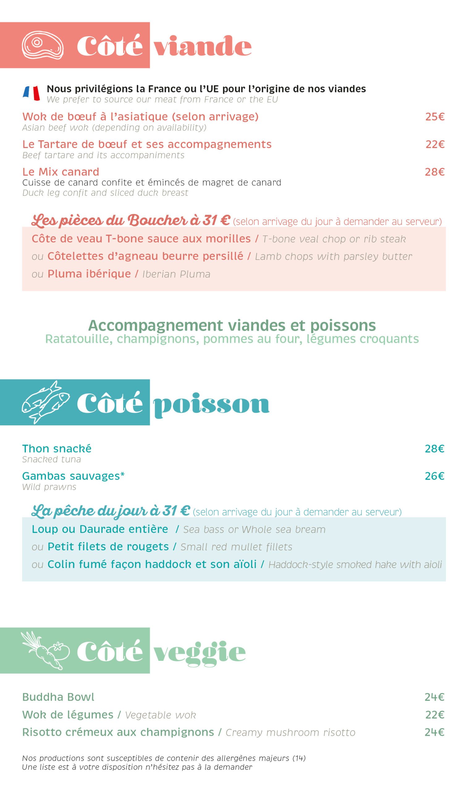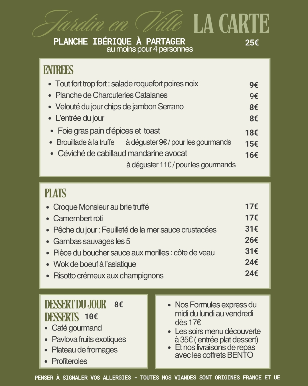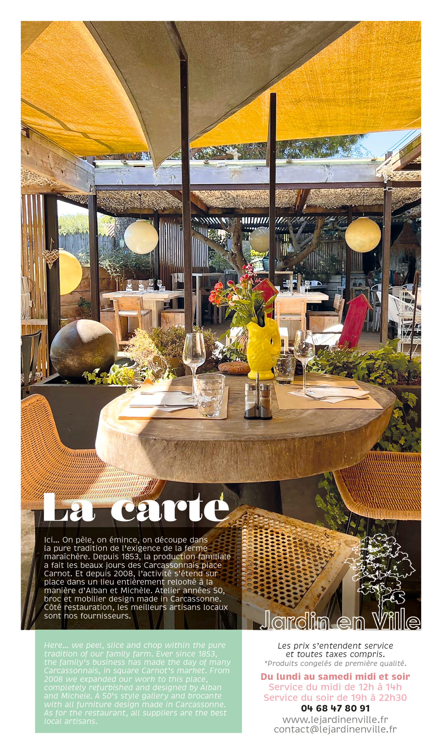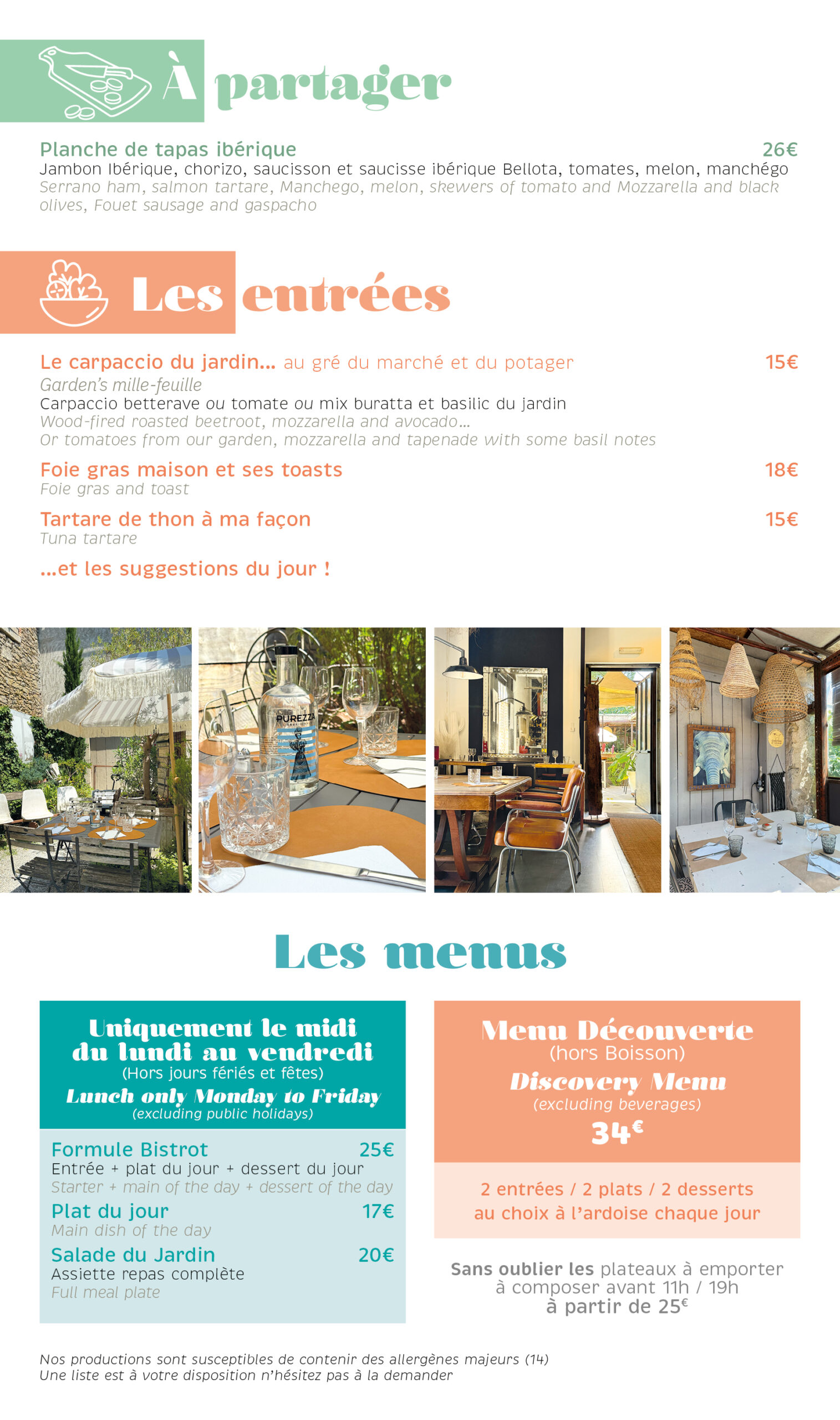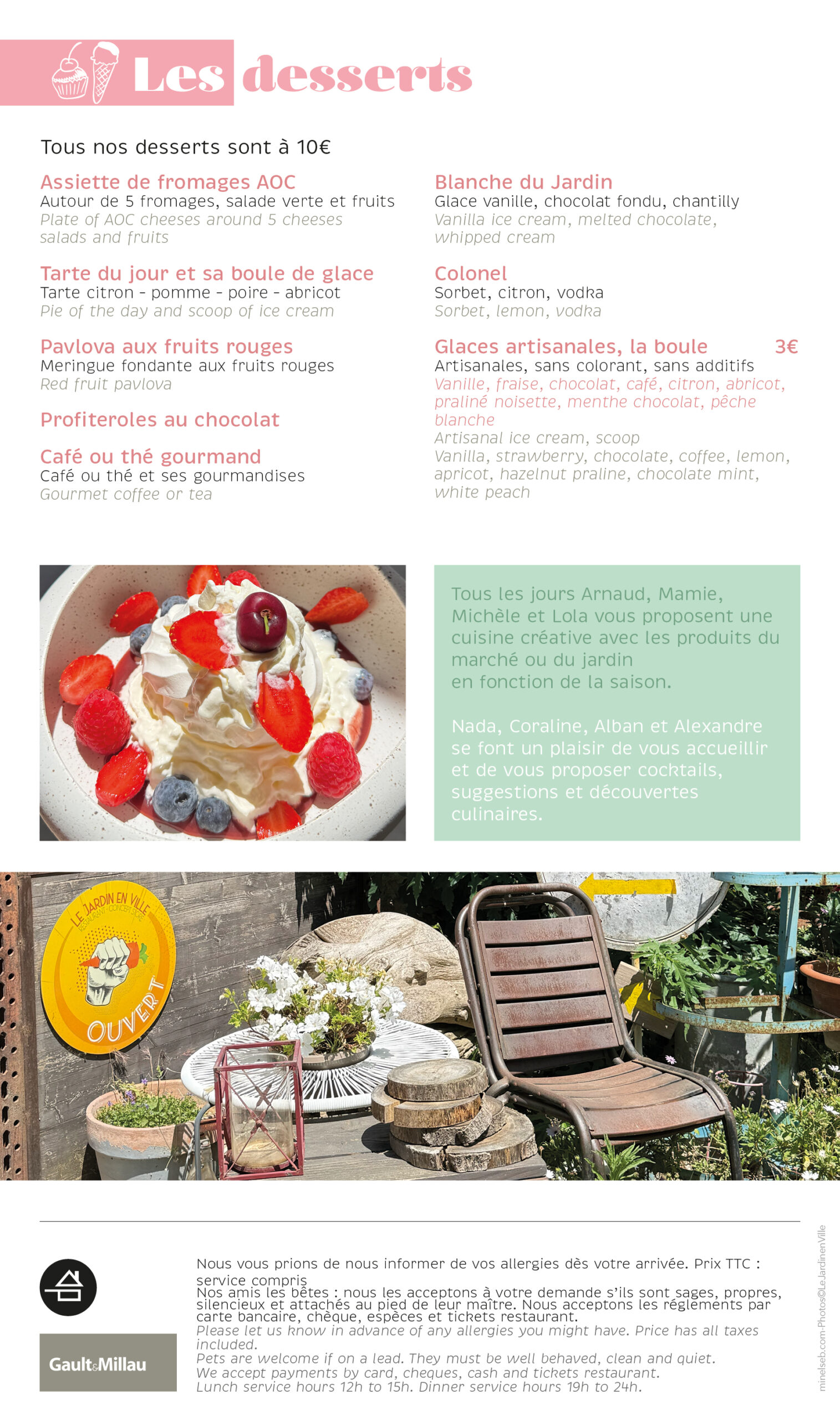 Elle évolue au grès des saisons des légumes et fruits qui soufflent leur originalité et leur particularité pour des associations de saveurs et de couleurs. Nos viandes sont toutes origines France, sud ouest et nos poissons sont particulièrement sélectionnés pour l’équilibre de nos recettes. Les « Végan » sont le bienvenus car toutes nos recettes sont à base de légumes… nos légumes dès que notre potager peut les produire. Nous accueillons avec plaisir les végétarien, les végans sans oublier les amateurs de viandes et de poissons.